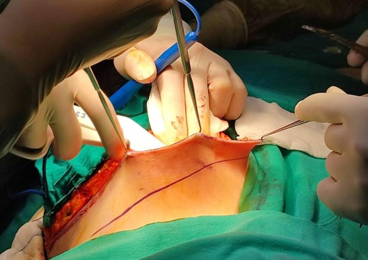 The surgery was started 20 minutes after the paravertebral dose was given in the patient whose sensory block level height of T2 to T6 was achieved unilaterally, evaluated by pinprick test, and Bromage score was 0. The patient, who was observed to tolerate the incision well, was administered nasal 2 L/min oxygen and remifentanil via IV infusion for sedation throughout the surgery, and the dose range was titrated according to hemodynamic changes and the Ramsey sedation scale. Throughout the surgery, the patient's Ramsay sedation scale was evaluated as 3, and the patient was hemodynamically stable and quite comfortable. The duration of the operation was around 155 minutes. All breast tissue and the armpit contents on the same side (fat tissue and sentinel lymph nodes) were removed (Figure 5). During the monitoring period, the patient did not mark any side effects, breakthrough pain, nausea, or vomiting. At the 4th hour after the surgery, the patient reported that she did not feel any pain, and after the 12th hour, when the visual analog scale was 6, paracetamol 1000 mg and 50 mg meperidine wasadministered in an IV. In the following days, no rescue analgesic or antiemetic medication was required. Oral feeding was started on the patient eight hours after surgery. The patient was discharged on the fourth day without any complications.