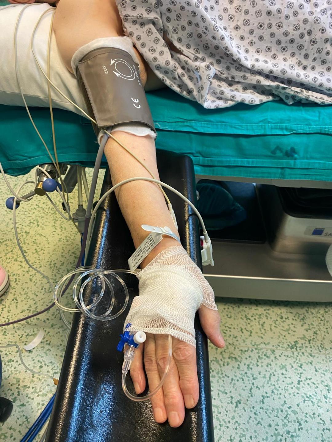 All risks and the planned anesthesia method for the patient were detailed to them. Due to shortness of breath on exertion, we did not apply premedication to our patients. After a short identity check and confirmation of the operation room, special monitoring was applied to the patient with PV. The 3-lead electrocardiogramelectrode was cleaned of adhesive coating and fixed to the wrists and left ankle with non-elastic bandages. The 20 G intravenous (IV) line was also fixed with bandages.The arm was padded with cotton dressing before applying a noninvasive blood pressure (NIBP) cuff (Figure 2). A nonadhesive pulse oximeter probe was also used. After standard monitorization, heart rate was 52/min, blood pressure was 160/85 mmHg,and peripheral oxygen saturation (SpO2) was 90%. Nasal cannula tubes were wrapped with cotton in areas directly touching the skin (Figure 3). At this stage, IV administered a prophylactic dose of cefazolin (2000 mg) and a 'stress dose' of dexamethasone (8 mg).