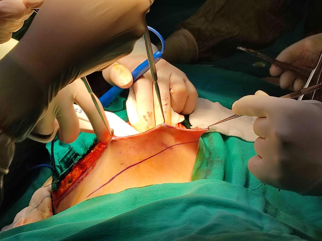 The surgery was started 20 minutes after the paravertebral dose was given in the patient whose sensory block level height of T2 to T6 was achieved unilaterally, evaluated by pinprick test, and Bromage score was 0. The patient, who was observed to tolerate the incision well, was administered nasal 2 L/min oxygen and remifentanil via IV infusion for sedation throughout the surgery, and the dose range was titrated according to hemodynamic changes and the Ramsey sedation scale. Throughout the surgery, the patient's Ramsay sedation scale was evaluated as 3, and the patient was hemodynamically stable and quite comfortable. The duration of the operation was around 155 minutes. All breast tissue and the armpit contents on the same side (fat tissue and sentinel lymph nodes) were removed (Figure 5). During the monitoring period, the patient did not mark any side effects, breakthrough pain, nausea, or vomiting. At the 4th hour after the surgery, the patient reported that she did not feel any pain, and after the 12th hour, when the visual analog scale was 6, paracetamol 1000 mg and 50 mg meperidine wasadministered in an IV. In the following days, no rescue analgesic or antiemetic medication was required. Oral feeding was started on the patient eight hours after surgery. The patient was discharged on the fourth day without any complications.
